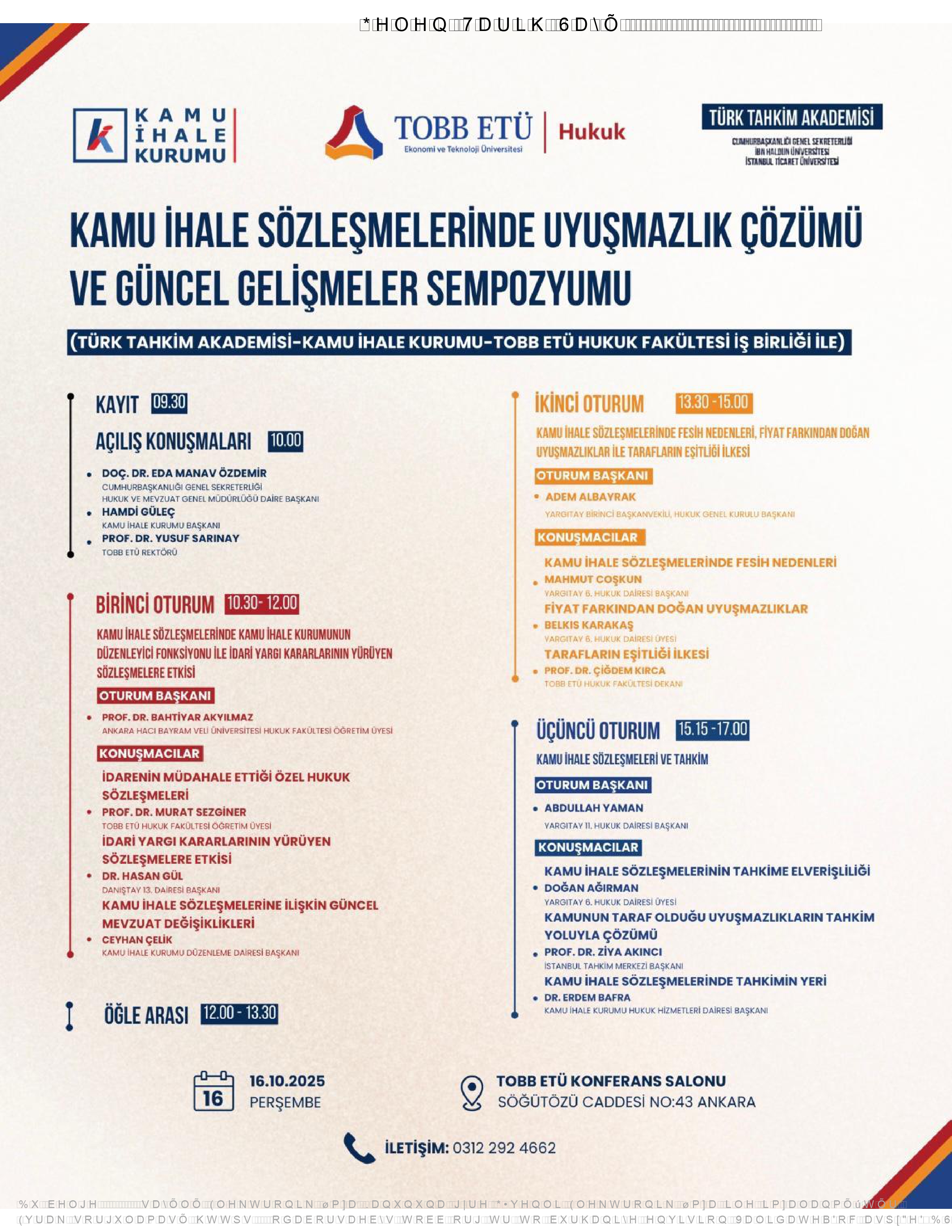 Türk Tahkim Akademisi, Kamu İhale Kurumu ve TOBB Ekonomi ve Teknoloji Üniversitesi Hukuk Fakültesi'nin iş birliği ile "Kamu İhale Sözleşmelerinde Uyuşmazlık Çözümü ve Güncel Gelişmeler Sempozyumu" gerçekleştirilecektir.