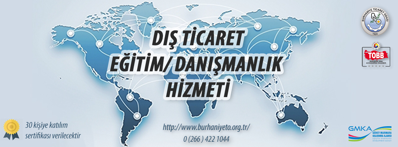 Proje Kapsamında ekte sunulan programda belirtilen tarihlerde 30 kişilik gruba 6 gün süre ile DIŞ TİCARET EĞİTİM/ DANIŞMANLIK HİZMETİ verilecektir. Eğitim Sonunda Katılımcı 30 Kişiye Katılım Sertifikası verilecektir. Katılım Sınırlı olup, Başvurular odamız http://www.burhaniyeto.org.tr web sitesi üzerinden veya Odamız 0 266 4221044 numaralı telefonundan Mehtap Uzunca ile irtibata geçerek kayıt olmanız gerekmektedir.