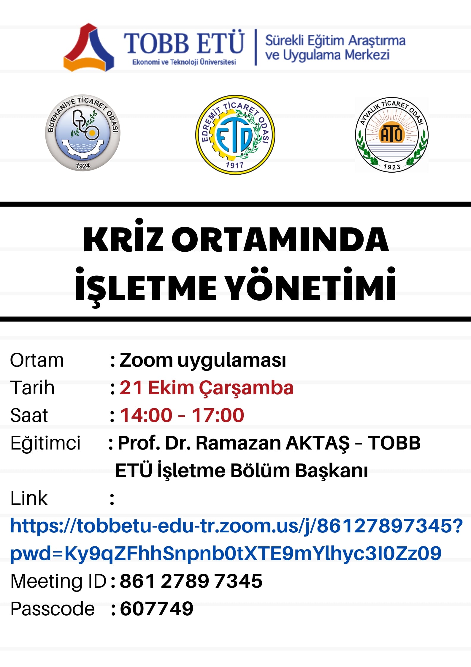 Burhaniye Ticaret Odası, Edremit Ticaret Odası ve Ayvalık Ticaret Odası organizasyonu TOBB Ekonomi ve Teknoloji Üniversitesi işbirliğiyle TOBB ETÜ İşletme Bölüm Başkanı Prof. Dr. Ramazan AKTAŞ’ın sunumlarıyla üyelerimize yönelik ” Kriz Ortamında İşletme Yönetimi Eğitimi” gerçekleştirecektir.