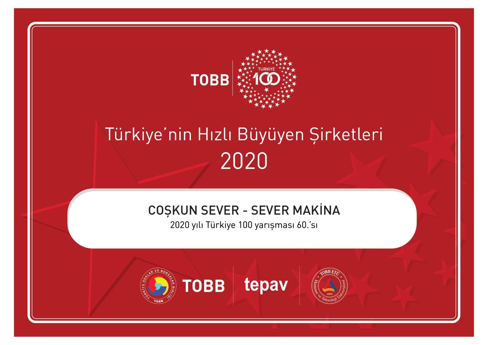 Türkiye Odalar ve Borsalar Birliği (TOBB), TEPAV ve TOBB ETÜ’nün katkılarıyla düzenlenen TOBB Türkiye 100 Ödül Töreni’nde, Türkiye'nin 2016-2018 dönemindeki satış geliri artış hızı sıralamasına göre en hızlı büyüyen ilk 100 şirketi kamuoyuna ilan edildi.